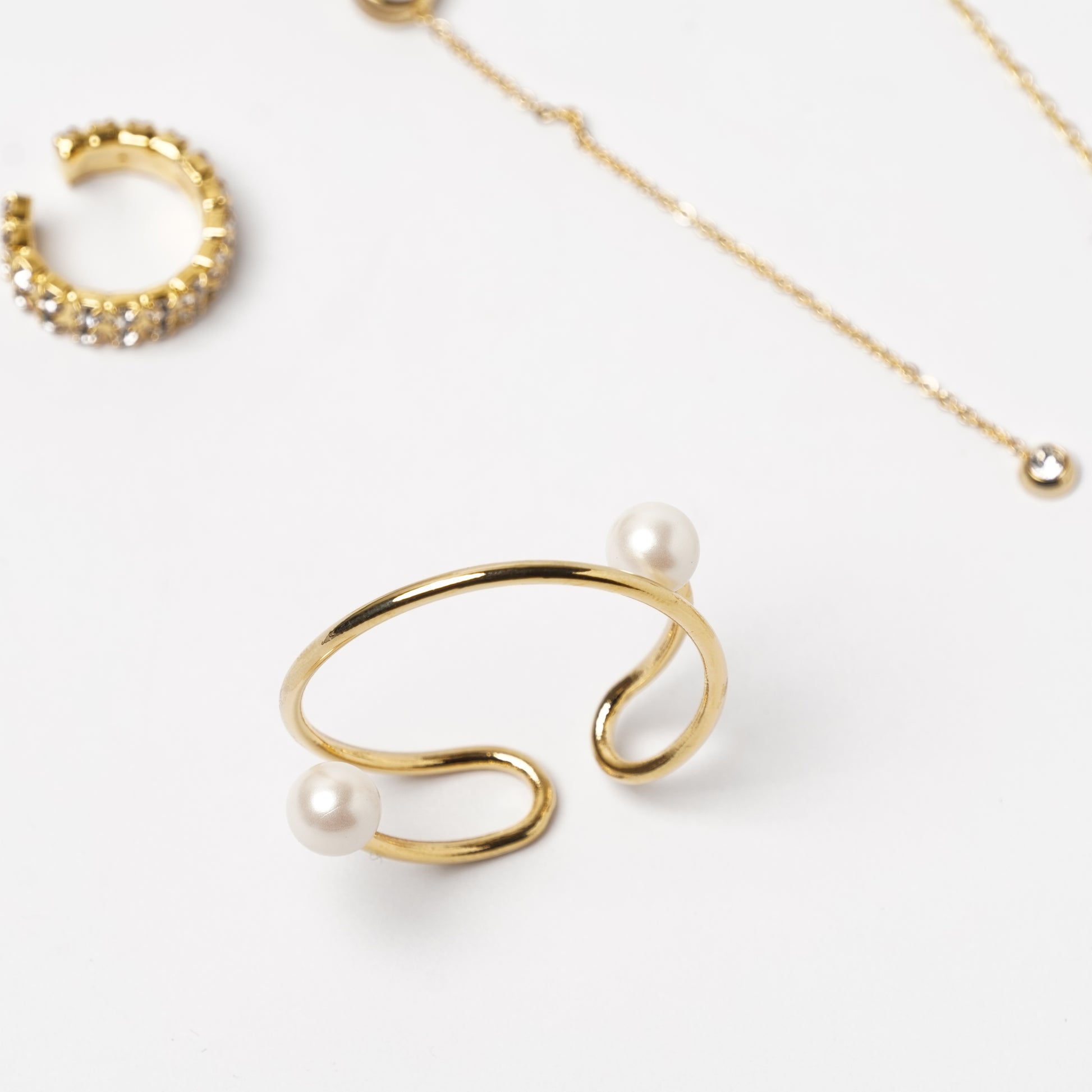 Each ear cuff features gracefully floating pearls in varying sizes, creating a subtle yet eye-catching galaxy-like design.